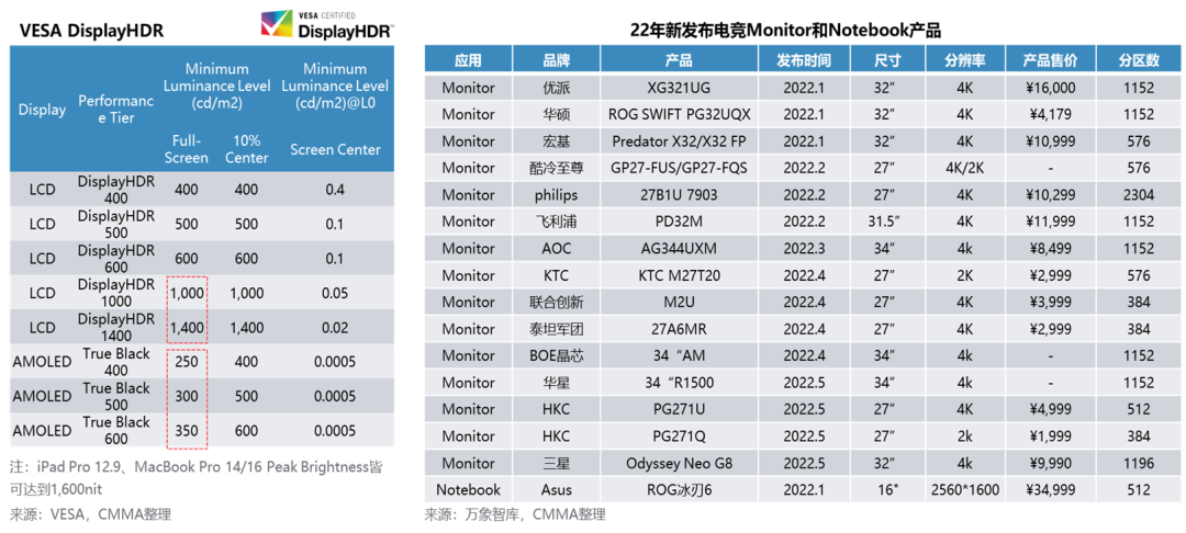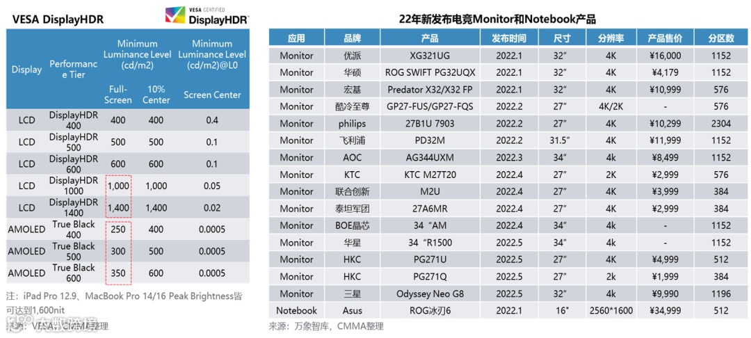 RGB AMOLED在中尺寸应用上依旧面临户外高亮、高刷新的技术挑战,对于非苹果阵营Mini LED背光中尺寸产品,240/300/360/480Hz高端电竞Monitor和电竞笔电将会是较好的前期切入市场。