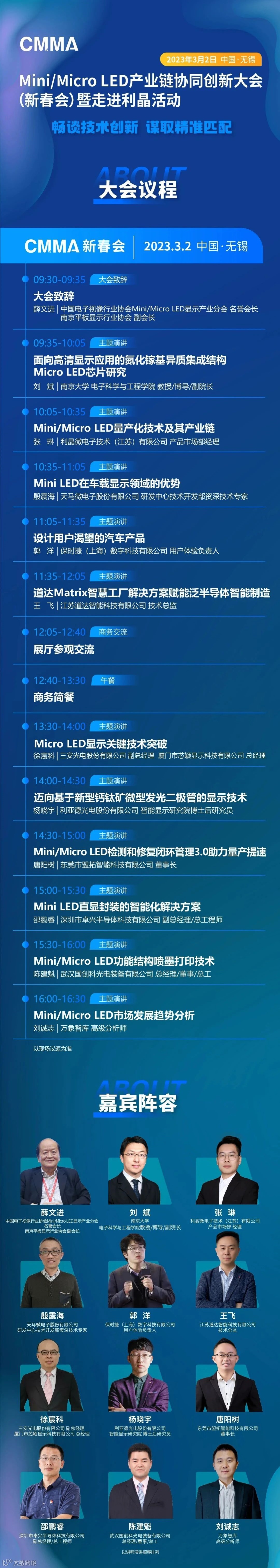 3月2日,中国电子视像行业协会Mini/Micro LED显示产业分会组织了Mini/Micro LED显示产业的开年首场活动——Mini/Micro LED产业链协同创新大会(新春会),强化区域间企业间产品、技术和商务沟通。届时利晶微电子技术(江苏)有限公司产品市场部经理张琳先生将做《Mini/Micro LED量产化技术及其产业链》的主旨演讲,敬请期待。