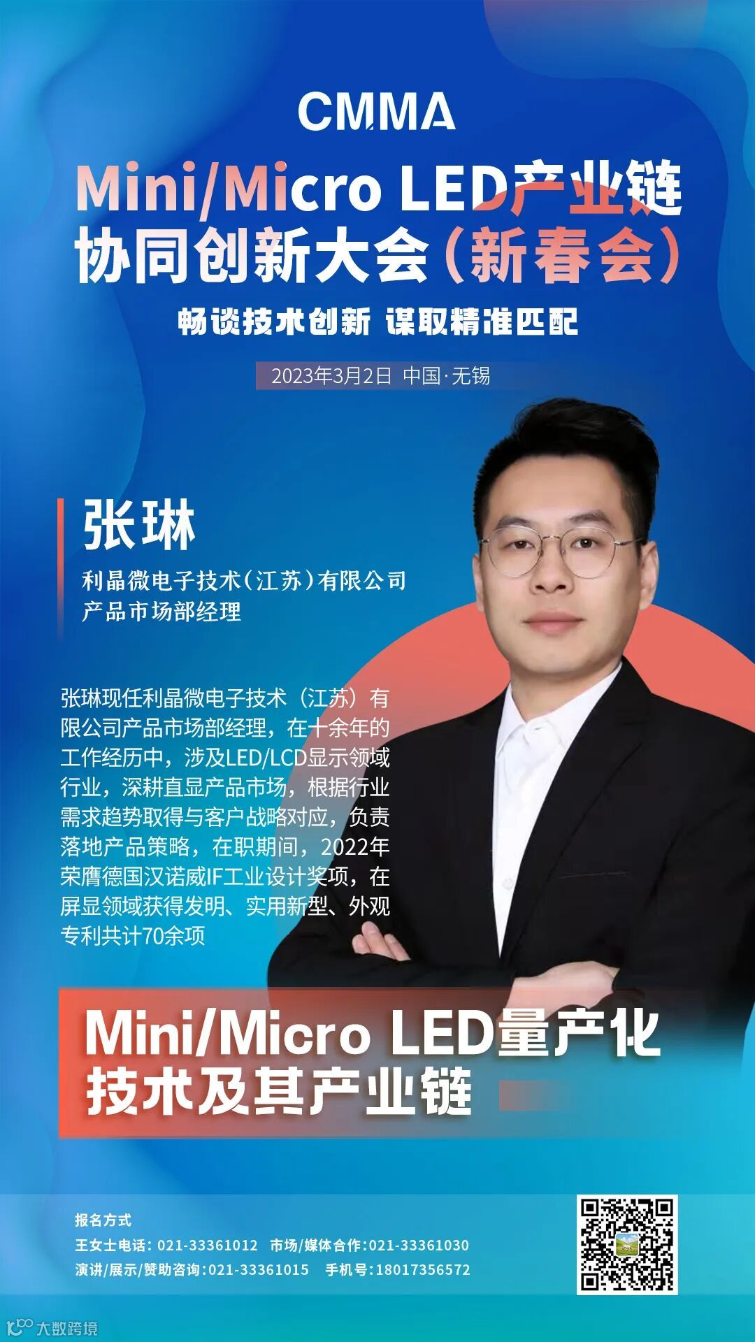 张琳,现任利晶微电子技术(江苏)有限公司产品市场部经理,在十余年的工作经历中,涉及LED/LCD显示领域行业,深耕直显产品市场,根据行业需求趋势取得与客户战略对应,负责落地产品策略,在职期间,2022年荣膺德国汉诺威IF工业设计奖项,在屏显领域获得发明、实用新型、外观专利共计70余项。