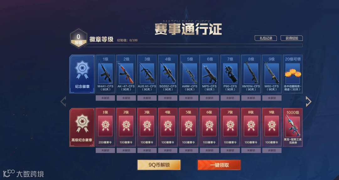 赛事通行证可通过活跃任务进行升级100经验升1级