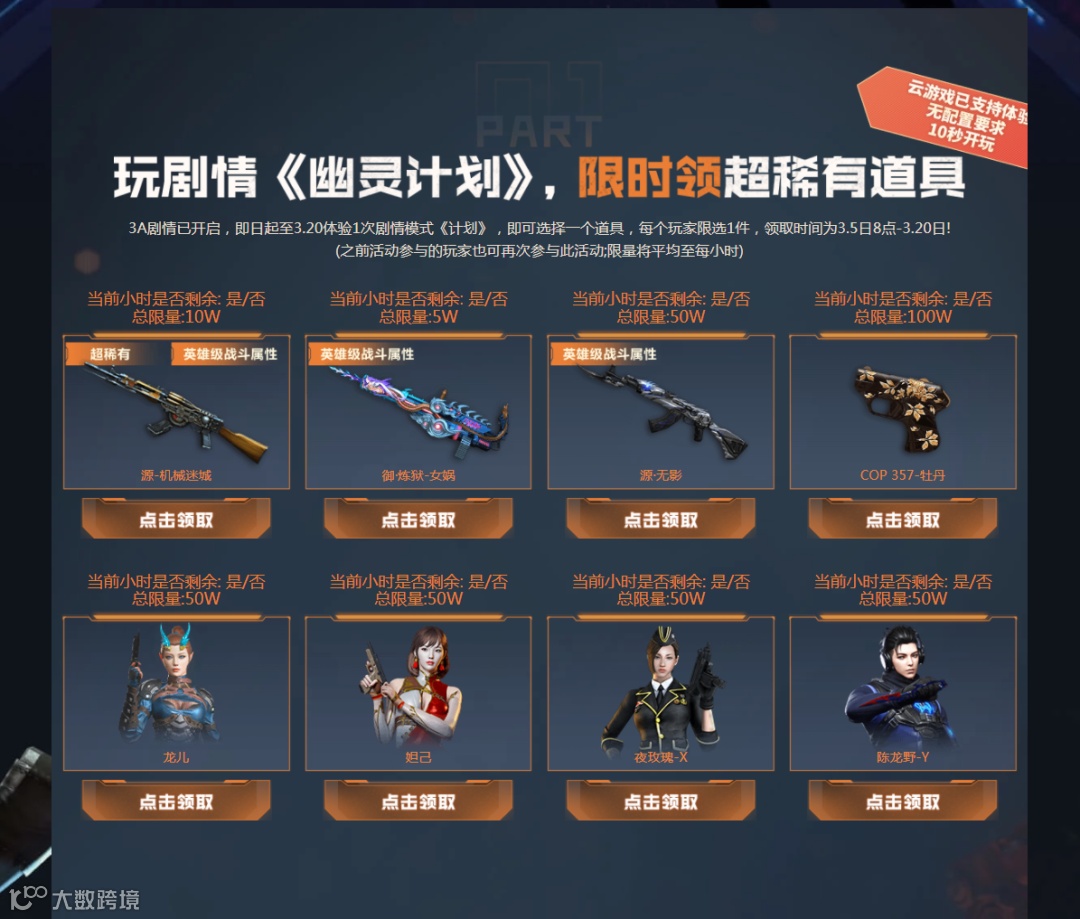 此板块的道具需要体验1次CFHD的剧情模式才可领取
