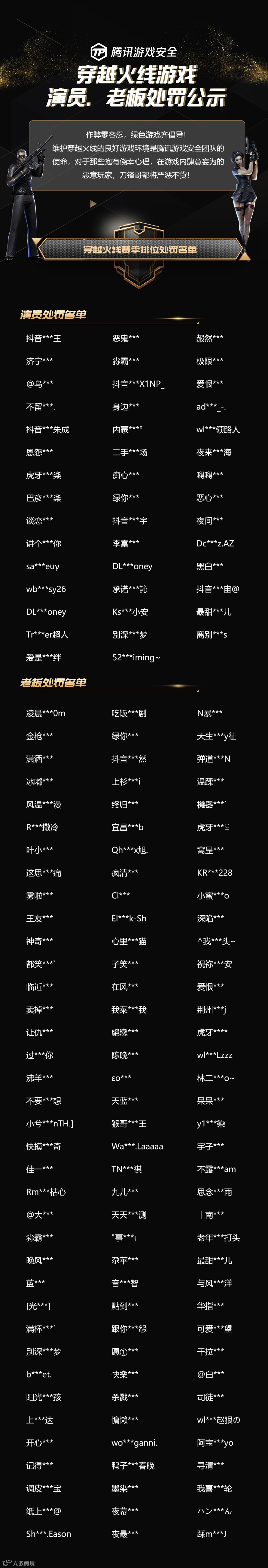 临近CF排位赛赛季结束,游戏安全团队针对中排位存在的恶意演员、带老板刷分等严重影响正常玩家游戏体验,极大程度破坏排位系统公平匹配机制操作的违规行为进行排查,经安全团队核实确认后,现对以下玩家进行处罚及公示:
