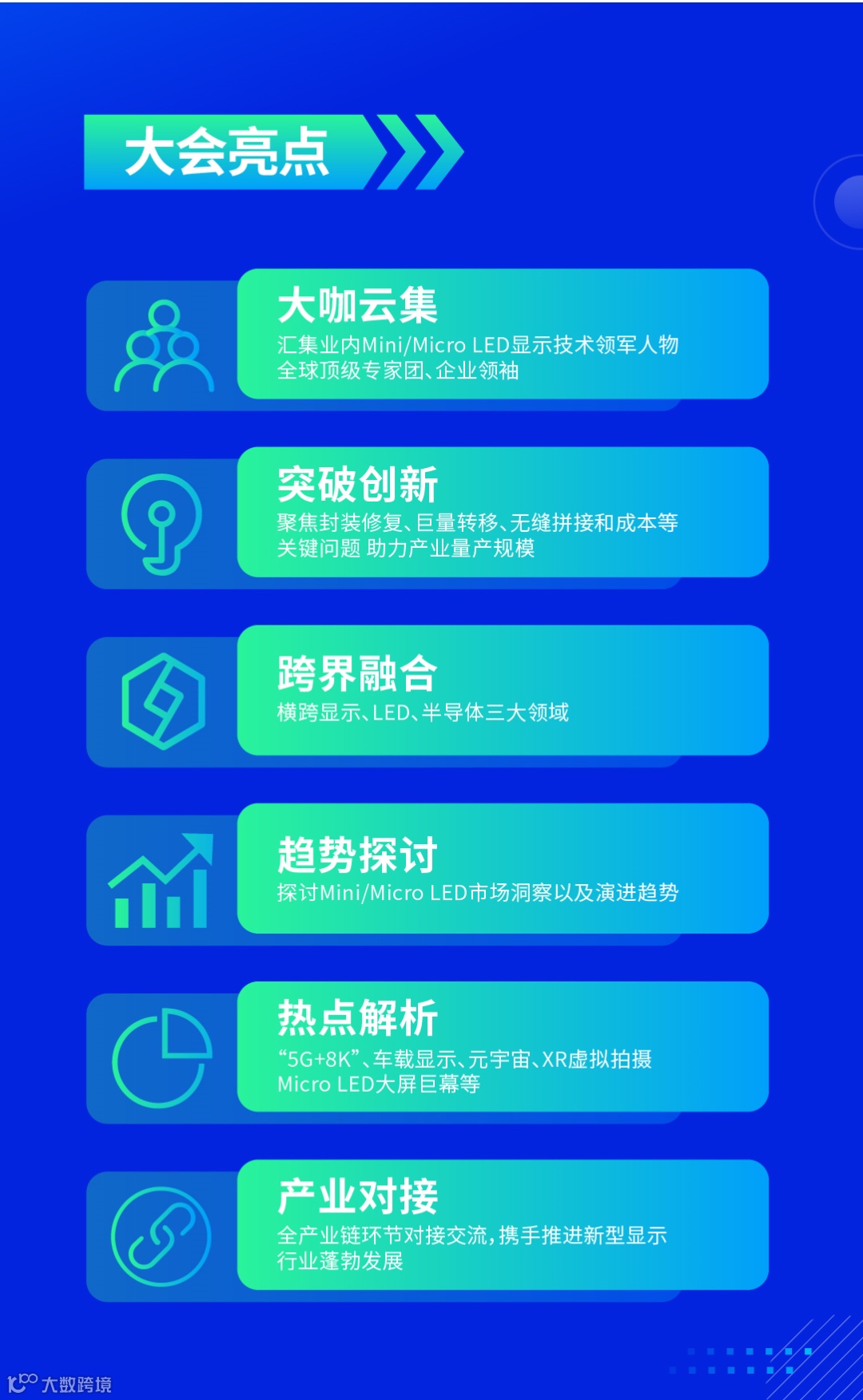 由中国电子视像行业协会Mini/Micro LED显示产业分会(CMMA)主办的“2022中国Mini/Micro LED产业生态大会”将于10月13日在深圳同期召开,大会以“产业聚合 助力显示新机遇”为主题,聚集产业链上中下游企业参会探讨产业生态升级,构筑本土显示产业链安全,解决Mini/Micro LED关键技术瓶颈,扩大量产化需求等热点话题,助力我国新型显示技术发展。