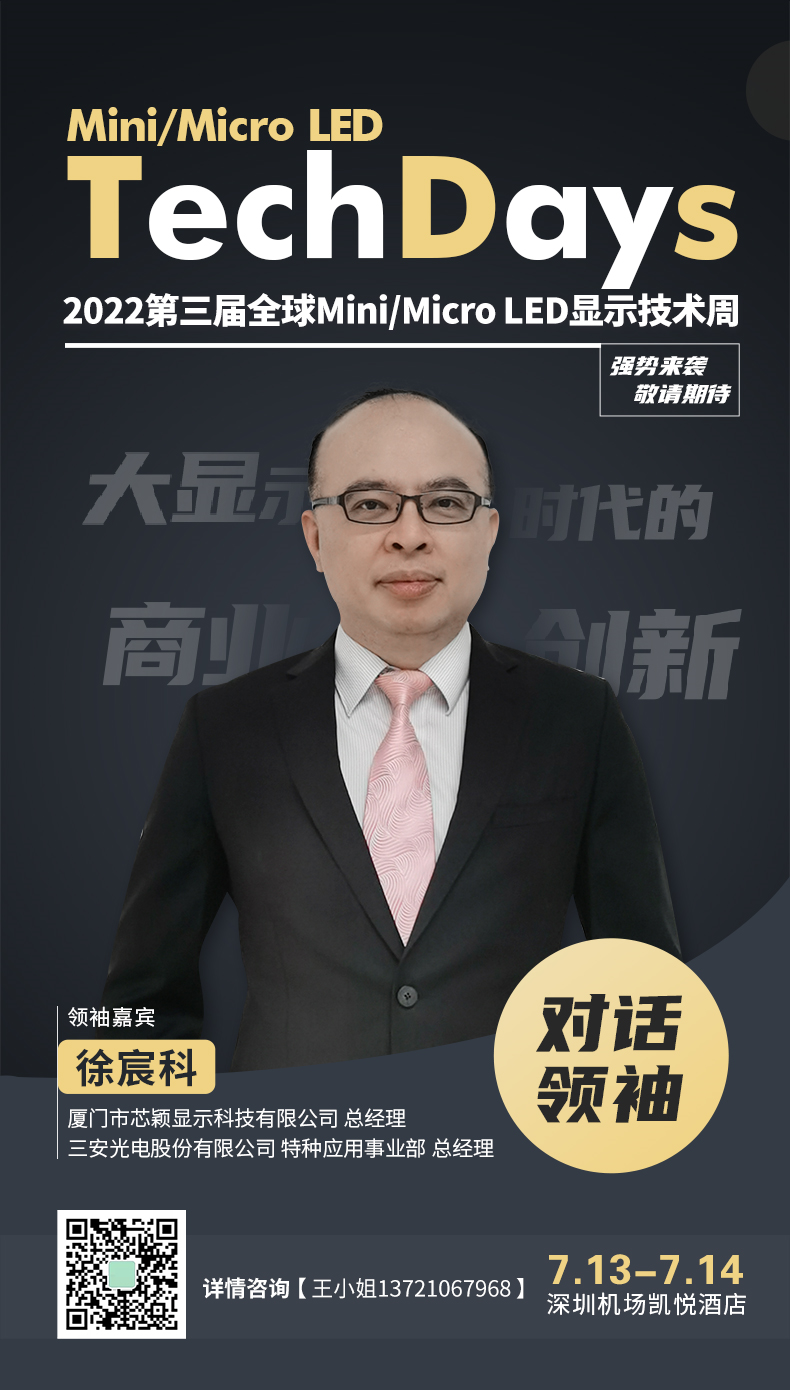 厦门市芯颖显示科技有限公司总经理、三安光电股份有限公司特种应用事业部总经理徐宸科受邀出席2022第三届全球Mini/Micro LED显示技术周, 与多位重量级嘉宾面对面对话,就“大显示时代的商业创新”进行深入探讨。相信行业标杆企业领袖们将为您带来一场精彩纷呈的高端对话,让您快速了解Mini/Micro LED的下一个五年战略。敬请期待!