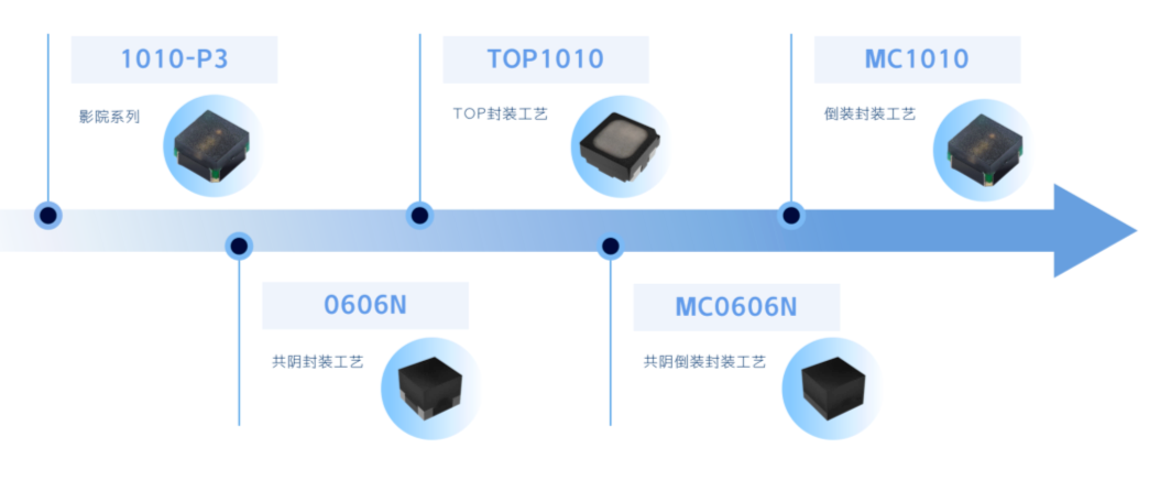 MC1010-A1产品采用倒装工艺,产品外形尺寸1.0*1.0*0.85mm,背面引脚焊盘及间距与晶台Chip 1010-S1完全相同,客户基板无需做任何更改。同时优化基板结构设计、电镀工艺、制程工艺和外封胶选型等多个方面,大幅提升性能及可靠性,同时提高了对比度和墨色均匀性。