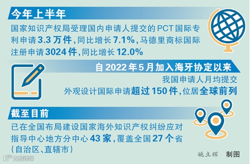 今年上半年,国家知识产权局受理国内申请人提交的PCT国际专利申请3.3万件,同比增长7.1%,马德里商标国际注册申请3024件,同比增长12.0%;自2022年5月加入海牙协定以来,我国申请人月均提交外观设计国际申请超过150件,位居全球前列……记者从国务院新闻办公室举行的2023年上半年知识产权工作新闻发布会上了解到,今年以来,国家知识产权局在护航企业“走出去”过程中发挥了积极的服务保障作用,我国申请人向外知识产权申请更加活跃。
