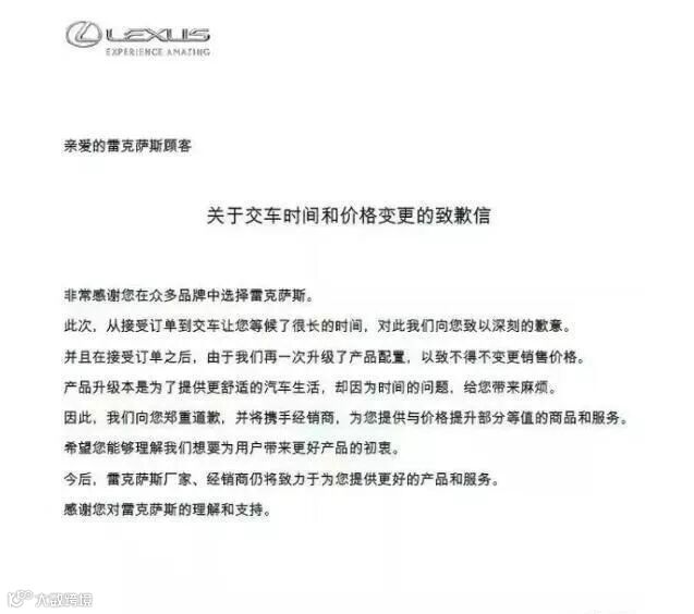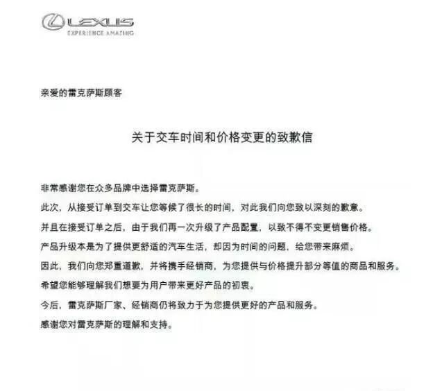 此后针对这种情况,雷克萨斯中国执行副总经理大竹仁发布了一封致歉信,甚至部分4S店出面承诺已经订车的消费者不再涨价,但是否真的没有涨价和取消涨价的通知,还是没有真实得到求证。
