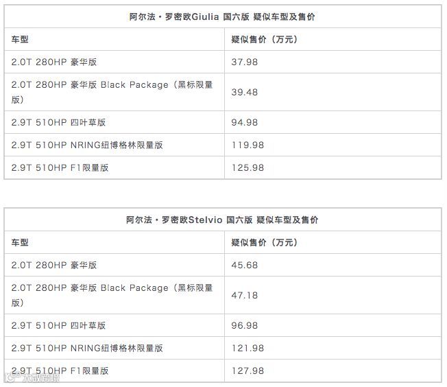 据国内媒体报道,阿尔法·罗密欧Giulia/Stelvio国六排放车型的疑似售价在网上被曝光了。Giulia将推出5款车型,售价37.98-125.98万元。Stelvio将推出5款车型,售价45.68-127.98万元。可以看出2.0T车型全部为280HP的高功率版本车型。