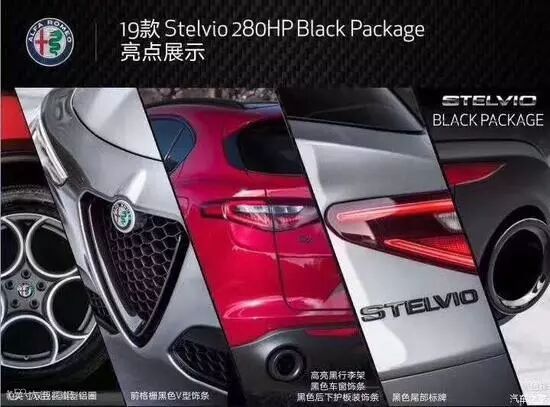 外观方面,Giulia Black Package(黑标限量版)的配置包括18英寸轮圈、前格栅黑色V型饰条、黑色尾部标牌、大灯底座熏黑、高亮黑外后视镜罩等。Stelvio Black Package(黑标限量版)的配置包括19英寸轮圈、前格栅黑色V型饰条、高亮黑行李架、黑色车窗饰条、黑色后下护板装饰条、黑色尾部标牌等。