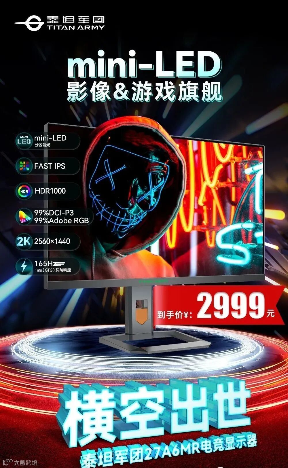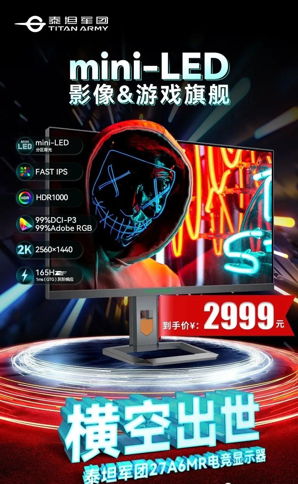 要什么样的价格才能推动Mini LED显示器的内卷,加速Mini LED成为显示器市场主流呢?泰坦军团的答案是2999元,对,泰坦军团最近推出了一款Mini LED精品-泰坦军团27A6MR的定价就是2999元。