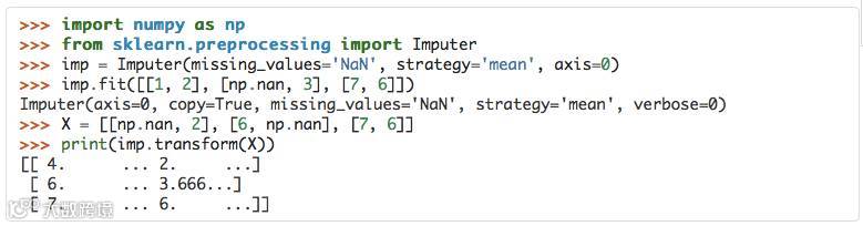 Imputer类提供了处理缺失值的一些基本方法,它把缺失值用它所在行或列的平均值,中位数或众数来代替。这个类同时也允许不同的缺失值编码方式。