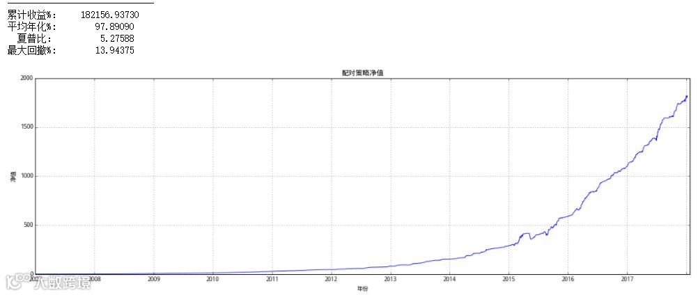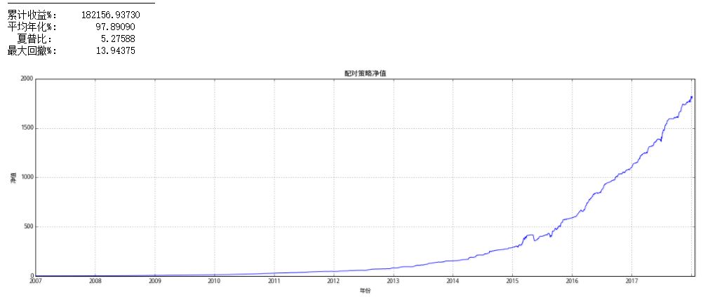 通过以上我们获得所有满足条件的股票,并按照上一节的股票对交易策略进行交易,即当价差大于1.5时做多以单位A,同时做空单位的B,当价差小于1.5时相反,当价差归零时清仓。我们测试了2007年至2017年的收益情况。结果如下: