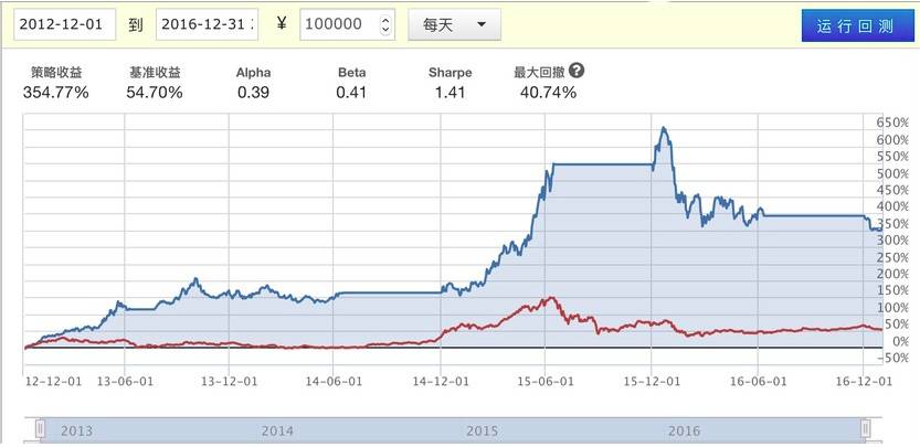 首先选取所有的影视类公司股票作为股票池,将买入时间设置为12.1,将迈出时间设置为6.12(为了将近年来端午节假期包括在内)进行回测,结果如下图