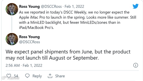 Ross Young 说,他不再期望新款 iMac Pro 在春季推出,目前看来,“夏季”推出的可能性更大。预计面板将于 6 月开始发货,8 月或 9 月发布。