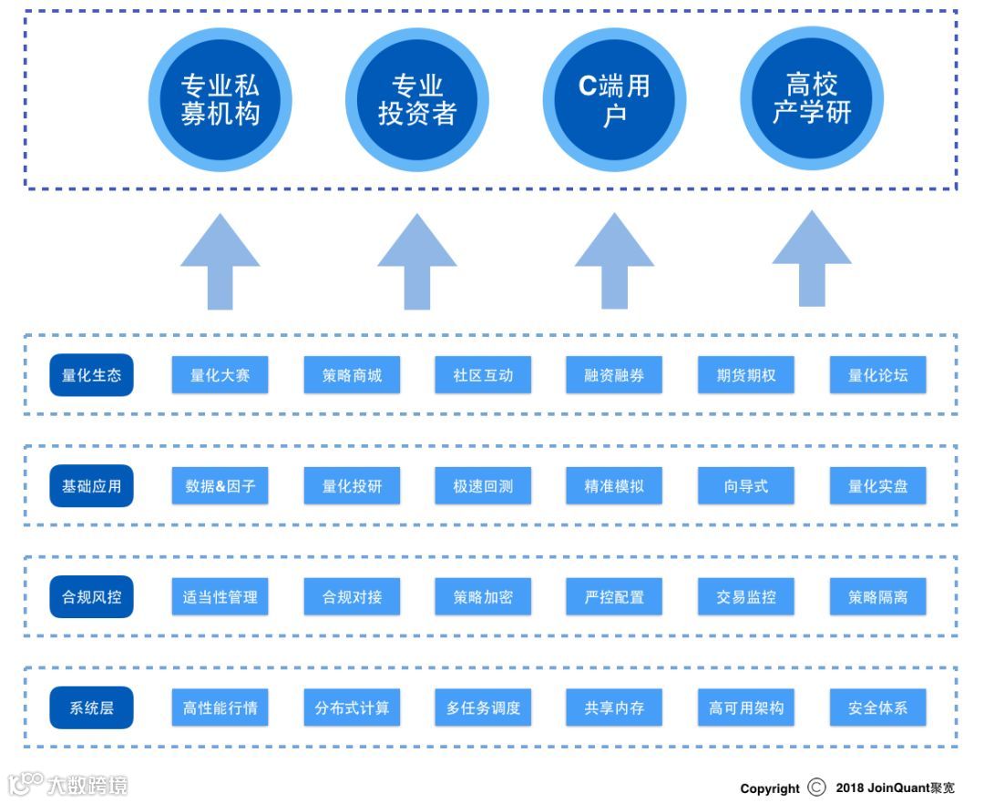 作为国内量化行业领先的技术平台,聚宽已经服务了超过12万的量化策略开发者、500+私募机构客户、20+券商(包括9家国内TOP15的券商)和投资咨询公司、公募、银行等金融机构,凭借专业的技术产品、快速的迭代创新、开放的商业模式以及接地气的合作态度,聚宽占据了券商量化交易平台绝对市场份额,奠定了国内量化行业的领先地位。