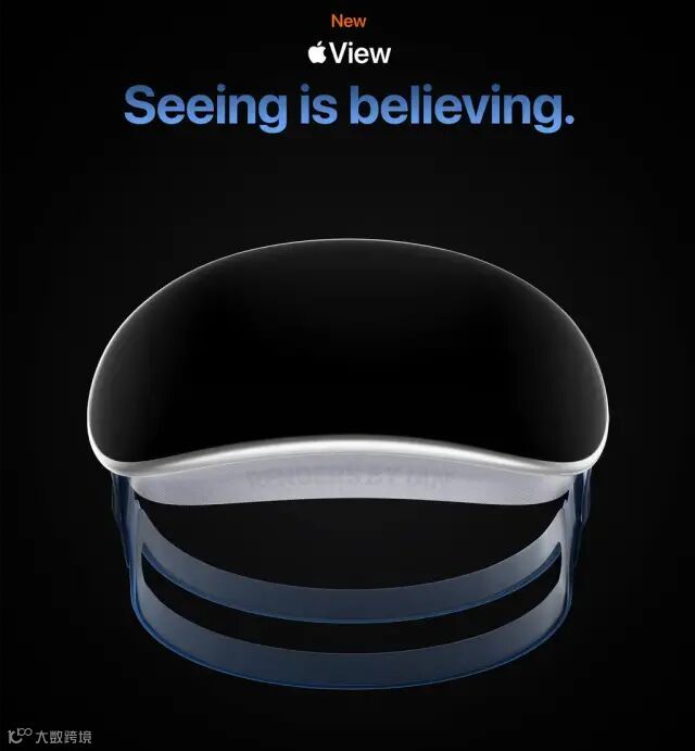 你可以看到表带如何类似于 Apple Watch 运动版的表带,并有一个圆形金属扣和一个安全环。头显本身看起来是由与 AirPods Max 相同的银色铝制成的,并有一个网状的垫子,可以放在用户的眼睛周围。头显的正面是一个光滑的弧形玻璃面板。