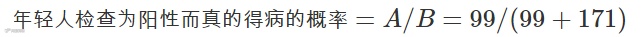 上图中,箭头附近的数字表示各种情况的概率。例如,没病然而检查为阳性(说明误诊了)的概率是1%,没病而且检查为阴性的概率是99%。如果一个年轻人去医院体检,体检结果是有病,那么这个人到底是有病还是没病呢?或者说这个人真实得病的概率有多大呢?