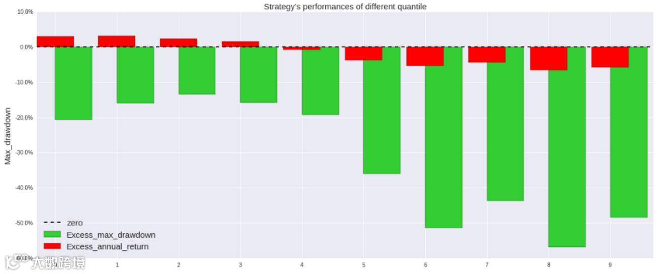 最后,可以通过 parameter_analysis.get_excess_eval() 获得超额回报和超额回报最大回撤的柱状图。可以看出,超额回报要明显小于策略原始回报,因为剔除了大盘整体的收益。同时,最大回撤也拉开了距离;按照策略净值算的最大回撤由于经历过同样的股灾,所以最大回撤都是百分之七十多,但在剔除大盘影响之后就能比较清晰地对比超额收益的回撤。整体来说,按 BP 选股的各个分为超额收益都不高,并且相对于基准的超额回撤都不小。