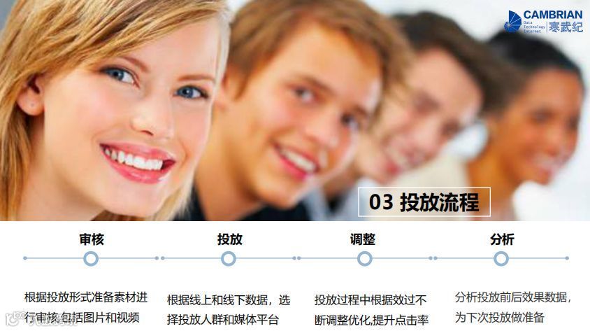 寒武纪精准投对接众多媒体平台,且有10亿+线下大数据作为支撑,可以通过人群标签选择人群进行精准投放,并对人群进行持续潜移默化的影响。成本相对低廉且灵活可控。