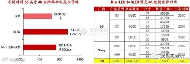 得益于LED产业链成熟的优势,Mini LED背光成本是同尺寸OLED背光的60%-80%:以65寸4K面板为例,20,000颗Mini LED背光65寸4K电视面板成本约860美元,而5.5代OLED背光同规格的模组成本约1,100美元。