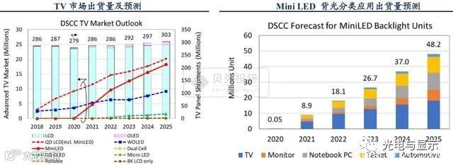 据称,苹果的供应商已经开始为将于2021年发布的新款iPad Pro生产Mini LED背光。随着供应链的成熟和制造成本的降低,根据DSCC的分析,Mini LED背光产品销量最大的三个细分市场将是电视、笔记本电脑和平板电脑。根据DSCC的预测,到2025年,Mini LED背光的总出货量将超过4800万台。