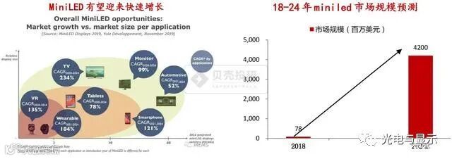 随着产业链成熟和下游需求放量,Mini LED价格可能进一步下降,Mini LED背光有望在电视、电脑显示器、平板电脑、汽车面板等终端迎来快速渗透,根据集邦咨询预测,受益终端需求旺盛,Mini LED市场规模有望迎来快速增长,从18年的7800万美元增长到2024年的42亿美元,CAGR为94%。
