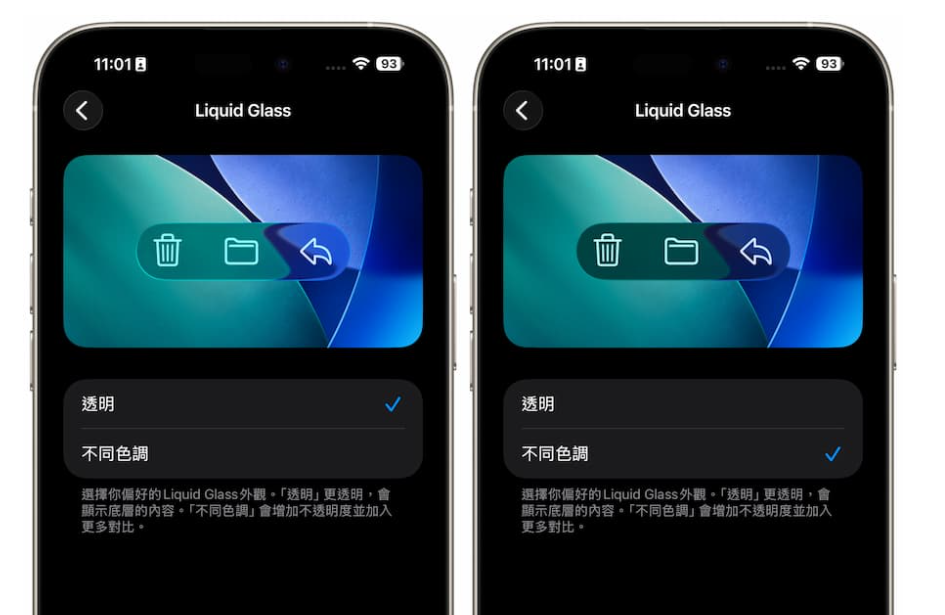 Liquid Glass(液态玻璃)视觉效果是在 iOS 26 被苹果首次引入的,现在在 iOS 26.1 Beta 4 中,透明度被加入了「清透」与「加深」的自订选项,默认样式是清透,可以让按键与选单下方的背景更明显,而加深模式则是提高不透明度,增强视觉对比,这对偏好稳重视觉层次的使用者来说算是实用的改进。