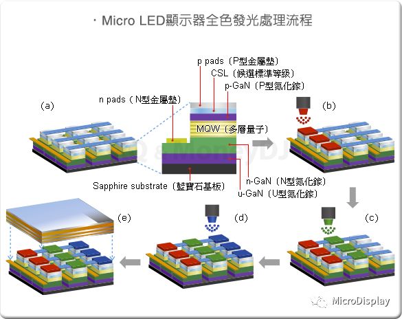 系将LED结构设计进行薄膜化、微小化、阵列化,其尺寸仅在1~10μm等级左右;后将μLED批量式转移至电路基板上(含下电极与晶体管),其基板可为硬性、软性之透明、不透明基板上;再利用物理沉积制程完成保护层与上电极,即可进行上基板的封装,完成一结构简单的Micro LED Display。