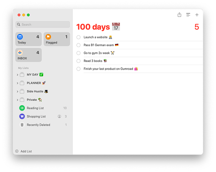 如果你会忘事,那就把这些都放进苹果提醒里,具体做法是建一个叫“100天”的清单,把想在年末前完成的任务和习惯都往里丢,像健身每周两次、读完三本书、上线一个产品、开一封简报啥的,提醒会把拖到十二月三十号的毛病扼杀掉。