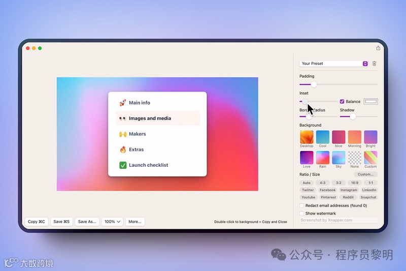 Xnapper 是 Mac 上截取高颜值截图的神器,即使你不会设计,也能拍出好看的截图。几秒钟就能完成截图、预览、分享,它还会自动优化截图,设置背景色,一键隐藏敏感信息。