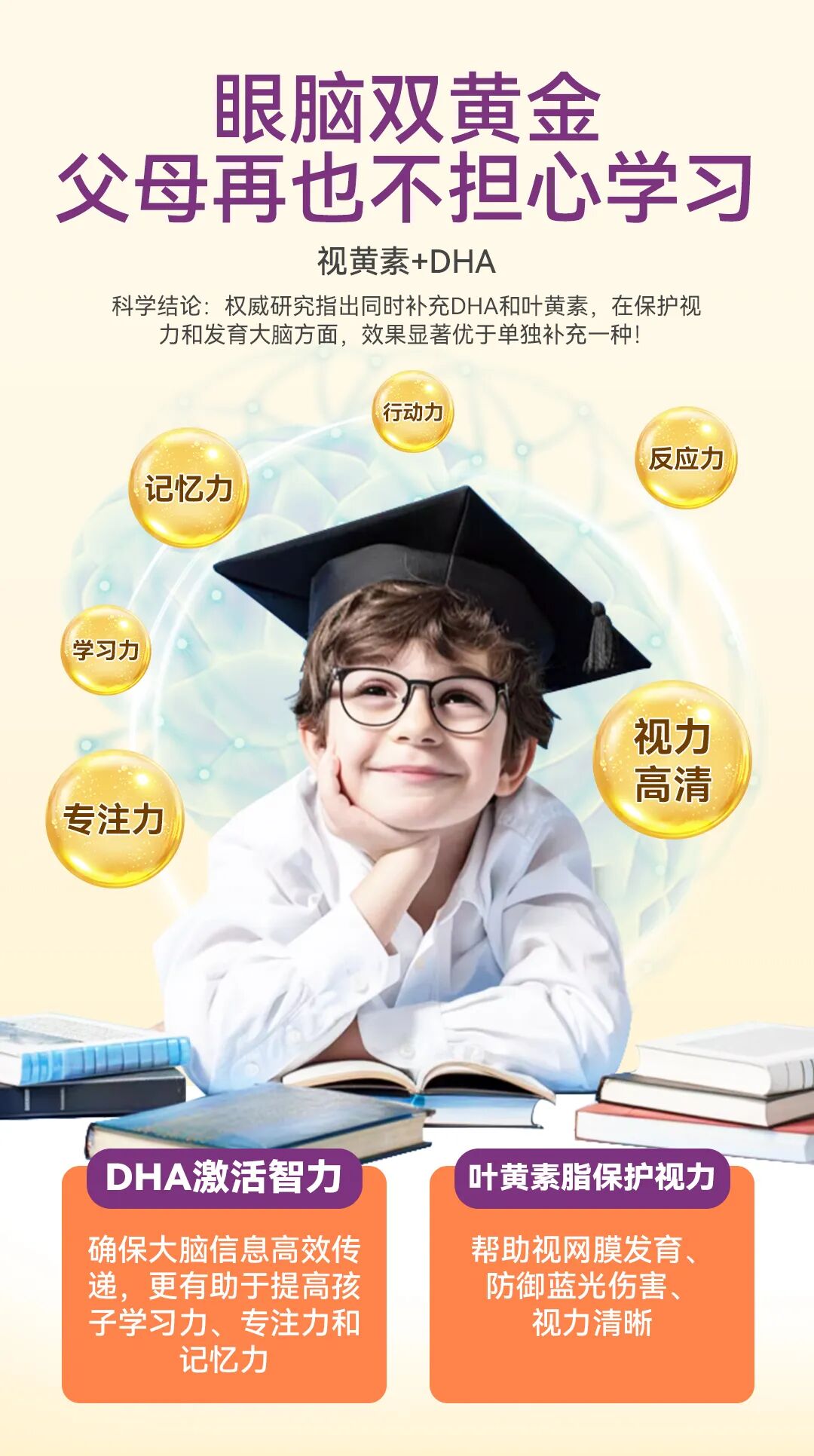 守护视力之余,我们更关心您和孩子的思维活力。因此,我们特别加入了另一项核心营养——DHA藻油。