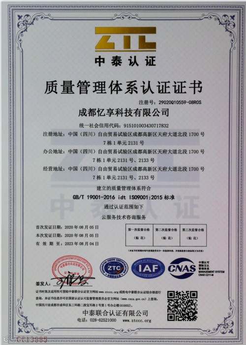 忆享科技于2020年8月5日通过全面审核认证,首次获得ISO 9001质量管理体系认证证书。据悉,ISO 9001质量管理体系认证每一年进行一次监督评审,每三年进行一次再认证评审。自推行ISO9001质量管理体系认证以来,忆享科技遵循ISO9001质量管理体系运行规范,以规范化、标准化、科学化的现代企业管理规范高质量运行,在云服务技术咨询方面纵深发展,严格按照质量标准进行产品服务管理,不断进行业务升级,为客户提供优质的产品与服务。