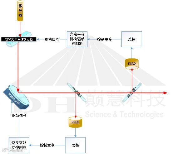 3.采用两次分光光路,分别将光路由两路PSD位置探测器进行检测,检测出的信号回传至总控系统,计算出补偿机构的补偿量,分别作为控制主令传输至双轴光束平移执行器和双轴快反镜,实现实时同步补偿。