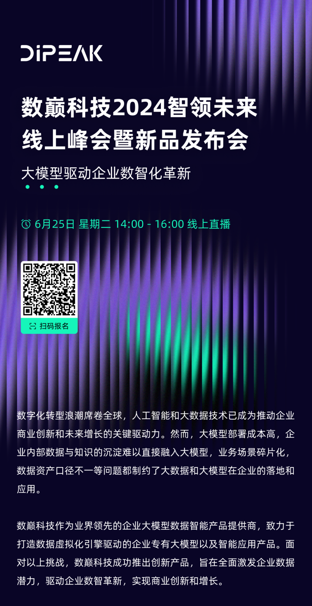 数巅科技成立于2022年,是业界领先的企业大模型数据智能产品提供商,致力于打造数据虚拟化引擎驱动的企业专有大模型和相关企业智能应用产品,辅助企业数字化升级,提升企业数智化决策能力。