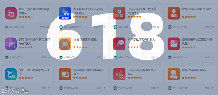 针对淘宝、天猫、京东、拼多多等主流电商平台,UB Store推出了对应的RPA自动化解决方案,覆盖营销推广、商品管理、订单管理、财务管理、数据监控、客户服务等常见电商环节,帮助商家自动完成电商大促期间重复琐碎且易出错的工作事项,降低成本、提升运营效率。