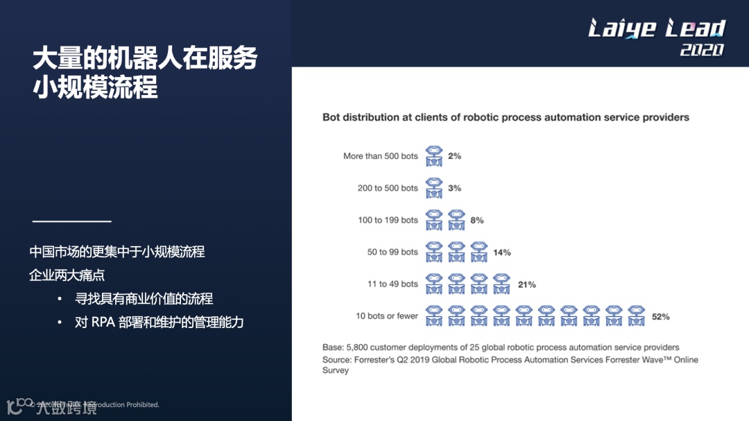 从这个角度而言,全球的RPA机器人,大部分集中在小规模的业务流程当中。这是全球市场的趋势,中国市场有少许不同。中国市场RPA起步稍晚,我们会看到RPA机器人,更多集中在十个及以下的场景当中。