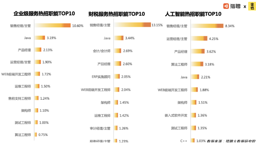 从三大领域的十大热招职能来看,比重最大的都是销售经理/主管类,占比均超8%。