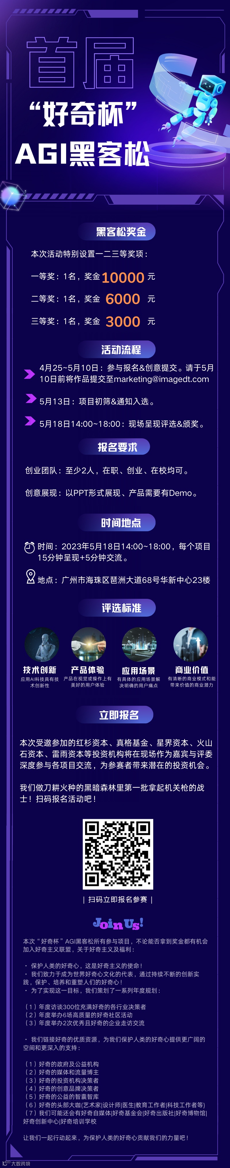 让我们一起行动起来,为保护人类好奇心贡献力量!扫码报名大赛,申请加入吧!
