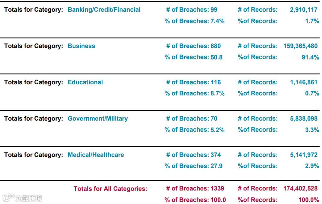(ITRC2017报告中,分行业数据泄露统计截图)