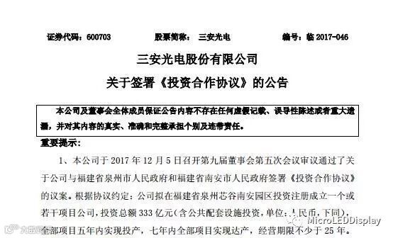 三安光电(600703.SH)12月5日晚间发布公告表示,公司与福建省泉州市人民政府和福建省南安市人民政府签署了《投资合作协议》议案。根据协议约定:拟在福建省泉州芯谷南安园区投资注册成立一个或若干项目公司,投资总额333亿元(含公共配套设施投资,单位:人民币,下同),全部项目五年内实现投产,七年内全部项目实现达产,经营期限不少于25年。产业化项目为:1、高端氮化镓LED衬底、外延、芯片的研发与制造产业化项目;2、高端砷化镓LED外延、芯片的研发与制造产业化项目;3、大功率氮化镓激光器的研发与制造产业化项目;4、光通讯器件的研发与制造产业化项目;5、射频、滤波器的研发与制造产业化项目;6、功率型半导体(电力电子)的研发与制造产业化项目;7、特种衬底材料研发与制造、特种封装产品应用研发与制造产业化项目。