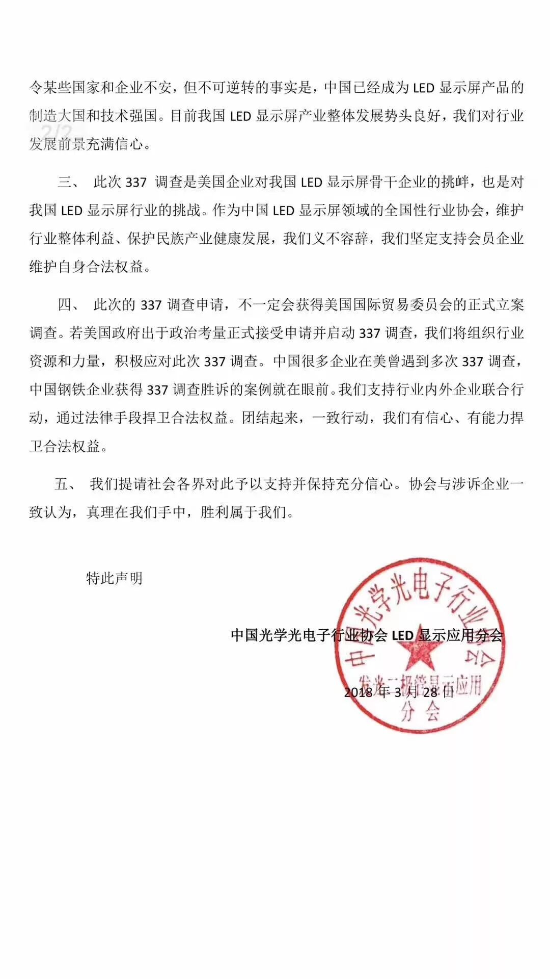 该消息一出,中国光学光电子行业协会LED显示应用分会第一时间与相关企业进行了积极沟通和研究,并发布声明,表达有信心、有能力和企业一起捍卫合法权益。以下为声明全文: