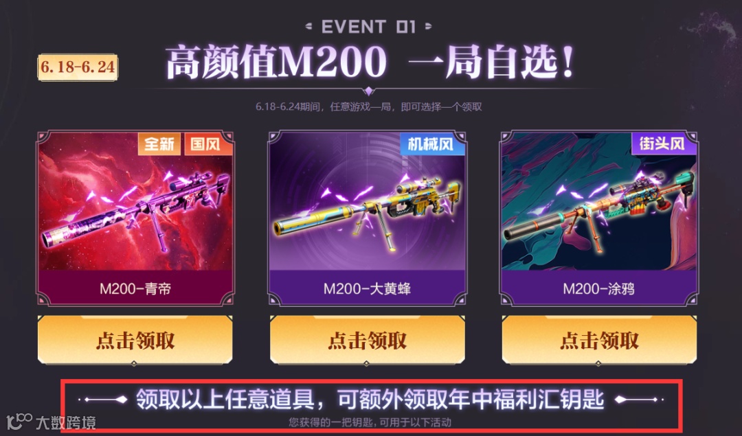 6月18日-6月24日 任意领取游戏一局领取M200可获得一把抽奖钥匙