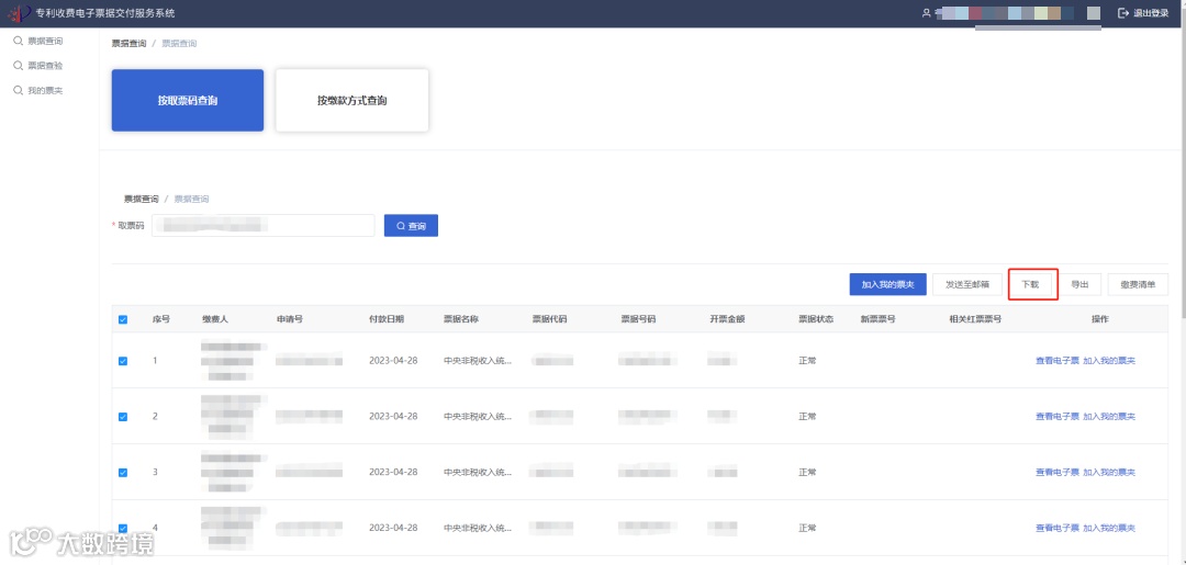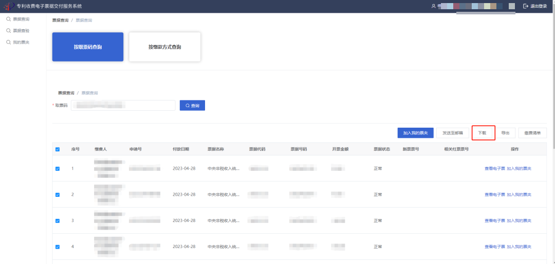 在“订单管理”页面中,已支付订单若已开具票据,“电子票据”字样会变成蓝色,点击“电子票据”可跳转到“专利收费电子票据交付服务系统”界面,取票码自动显示,选中票据信息,点击“下载”即可将票据下载至本地。