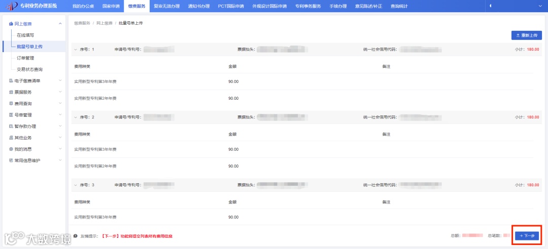 文件成功上传后,页面会显示模板中填写的费用信息,确认无误后,点击“下一步”进入“缴费人信息”填写页面。
