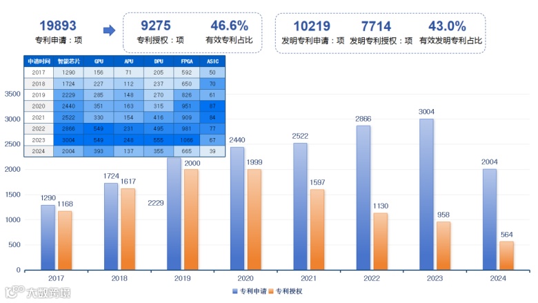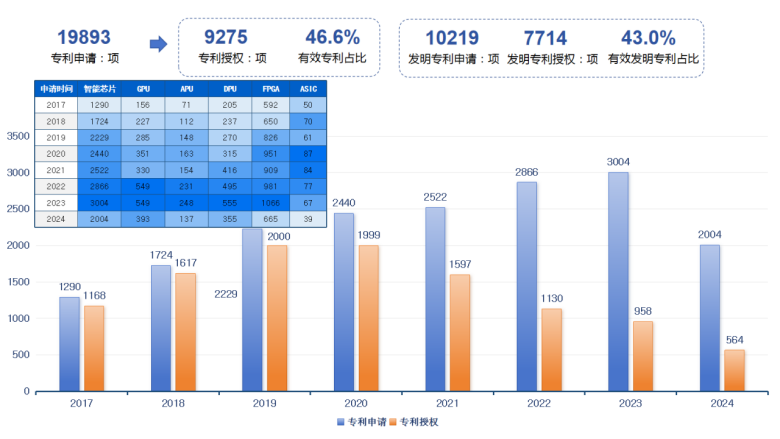 《报告》是工信部电子知识产权中心连续第七年就中国人工智能专利发展情况发布研究成果。《报告》显示,2017年至2024年间,我国生成式人工智能基础层(智能芯片和软件框架)、模型层和智能体公开专利申请数量达到167,634项,体现出强劲增长的创新发展态势。其中,智能芯片领域中国专利申请数量持续增长,截至2024年达到19893项,有效专利占比46.6%,年申请量从2017年的1290项增至2023年最高的3004项,年复合增长达18%以上。此外,专利申请人数量年均增长达到9.9%,与专利申请量呈现同步持续增长态势。多家科技巨头纷纷入局智能芯片领域,如华为的海思半导体、百度的昆仑芯、阿里巴巴的平头哥等。从细分领域看,当前智能芯片呈现通用与定制化多样化发展态势,截至2024年,与GPU相关专利2840项,APU相关专利1264项,DPU相关专利2848项,FPGA相关专利6640项,ASIC相关专利535项。总体上看,2017年至2024年,是智能芯片加速迭代与突破发展的阶段,通用芯片年度申请量稳步提升,针对高性能化、定制化芯片专利布局持续增长,整体呈现差异化、多元化的发展趋势。