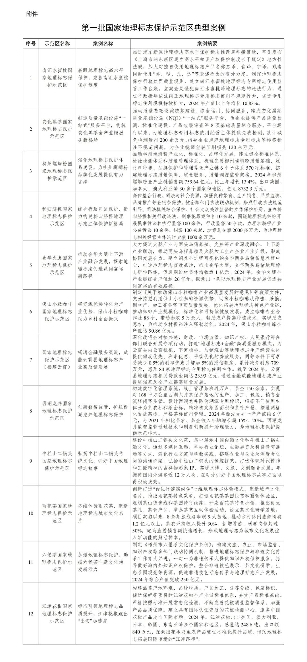 为推进国家地理标志保护示范区建设,充分发挥示范创建引领作用,进一步探索形成地理标志保护服务区域经济高质量发展的新路径。按照《国家知识产权局办公室关于征集国家地理标志产品保护示范区典型案例的通知》(国知办函保字〔2024〕884号),经组织申报、地方推荐、专家评审、综合评审等环节,确定了12个创新性强、成效较为突出、具备复制推广价值的案例,作为第一批国家地理标志保护示范区典型案例。