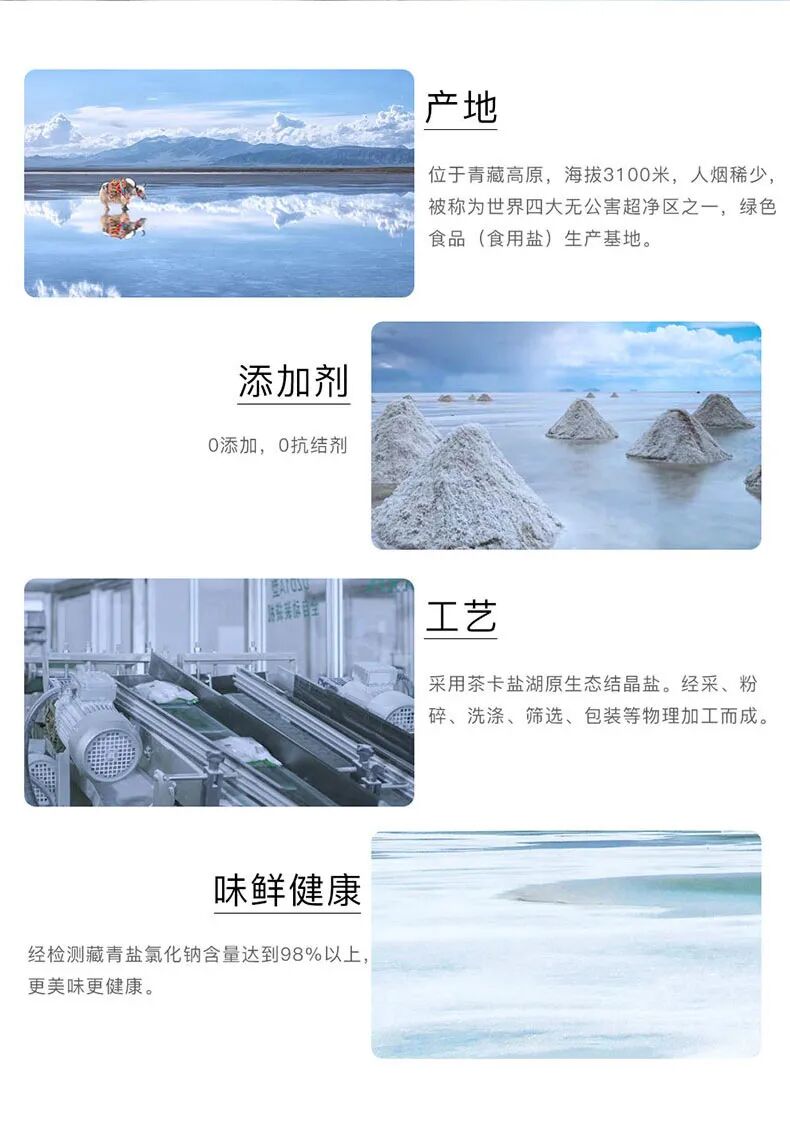 茶卡盐湖深层天然卤水经海拔3100米高强度紫外线日照,在无人产区湖底天然盐盖下自然结晶,再经采掘、纯物理工艺加工精选而成,粒匀质纯。系中国绿色食品发展中心认定的绿色食品A级产品和国家地理标志保护产品,适用于不宜食用加碘盐的人群。
