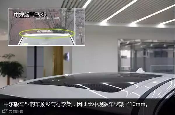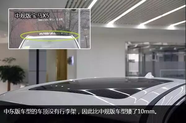 从上表中可以发现,中规版宝马X5符合进口车型进入国内后的一般表现,那就是:“长”,中东版比中规版短了23mm。而中东版车型比中规版车型矮了那么10mm高度的原因是:中东版没有车顶行李架。