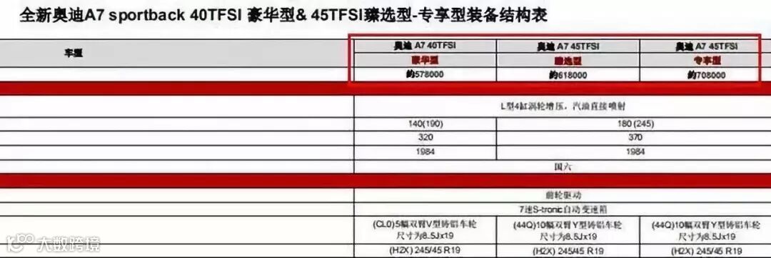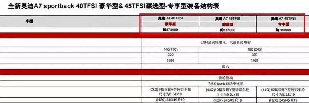 从图表中我们可以很详细的看到,奥迪A7 2.0T车型将推出三款车型,价格区间在57.80-70.80万元之间。三款车型中,一款最大马力190匹的40TFSI低功率车型,两款最大马力245匹的45TFSI高功率车型。而所有车型都将匹配7速双离合变速箱,且都为前驱。